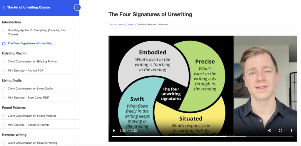 Aside from the recorded workshops, you’ll find other resources to deepen and sharpen your unwriting craft, which has become increasingly relevant in the age of AI. There are also materials on unmarketing, including recordings of the workshops.