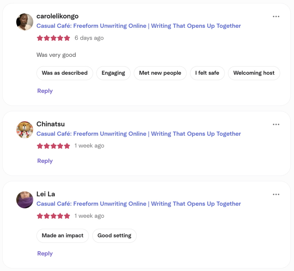 For the Craft and Client Café workshops, just the opening and closing parts are recorded and shared exclusively with paid members, so those who couldn’t attend live can watch them back. The unwriting exercise itself is not recorded. If you prefer not to appear in a recording, you can turn off your camera.